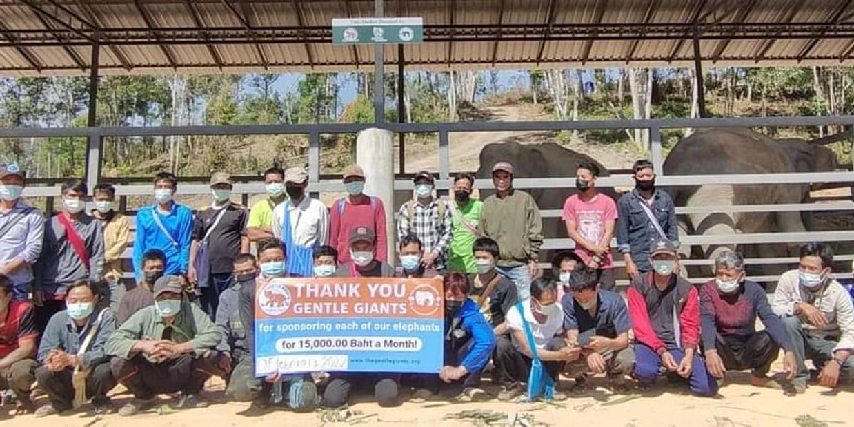More than a year ago, Lek and Diana were on the phone, Lek said she was heartbroken because 35 elephants would be taken the very next day to the very cruel logging industry. The owners were desperate, they had no other option to feed their families. Diana replied, they do have an option; GG will take them. "We will support them for a long as we can". 18 of those elephants were from Om Koi. And so, the relationship between the people of Om Koi and Gentle Giants Evolution began. Little did we know it would show the people at Om Koi a new life they didn't even know could exist. You see, for many generations the elephants from Om Koi were leased out to the different far away cities where tourist normally frequented. Along with the elephants, the young men from the village had to also leave. Sons, husbands, fathers were gone for years; working hard to send back whatever funds they could to support their families. Life was very hard, for both the elephants and the men. Even harder was the fact that the families had to be apart for long periods of time. So, when GG offered to support them, in exchange of pictures and videos of happy, healthy elephants, this opened a new world of possibilities for them. A new way of life. The village was happy to have their men back and happy to be able to care for their elephants. GG bought the fruit from the local farmers, so they too saw it was beneficial to have the gentle giants home. As the months passed the villagers realized they didn't want to go back to the way life was before Covid. In September, 2021 they reached out to our partner and friend Lek again, asking if we would build a chain free shelter. Of course, we said yes. The 1st ever chain free shelter was built at Om Koi. In November, 2021 Lek urged us to go to Thailand. The villagers wanted to meet with us. They wanted to keep 35 elephants home (this included the original 18), out of the tourist industry. We couldn't resist the idea of saving these precious lives from a terrible life of slavery. So, off to Thailand we went. While at Om Koi we were asked, on the spot, while in the meeting with the owners/mahouts, would GG help 20 more elephants. We knew that if we hesitated it meant losing these beautiful ones to slavery. We said YES... Typically we secure 2 months of support before accepting a new project, but time did not allow for this if we wanted to keep these 55 sentient beings home, safe, together, unchained in their natural forest habitat. Regardless, for 6 months now, we have made it happen and have been supporting all 55 gentle ones. To say it's been incredibly hard because of the heavy financial responsibility is an understatement! Together we keep these gentle giants free from all abuse and cruelty!